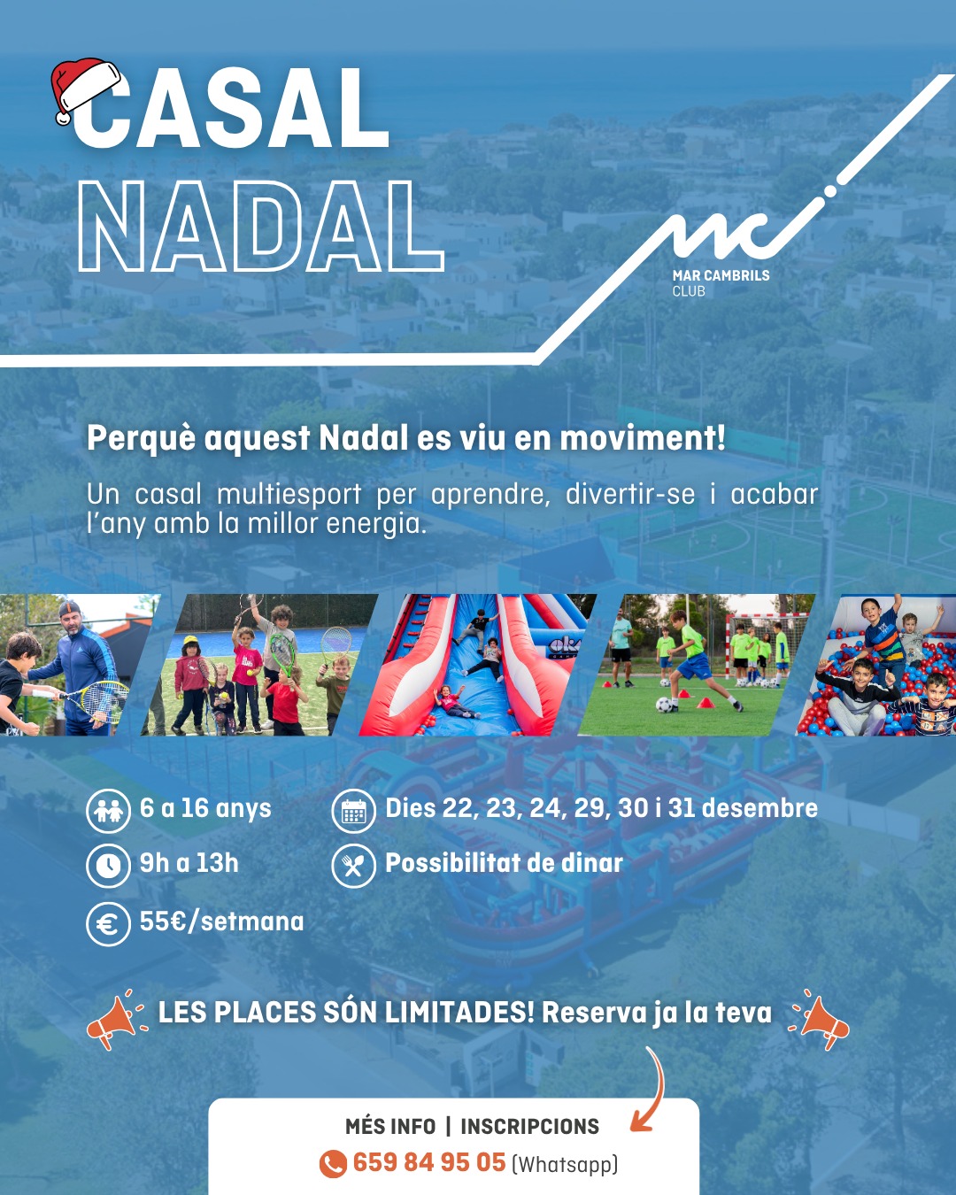 Si buscas un casal diferente donde los niños y niñas disfruten al máximo mientras hacen deporte en un entorno natural, Mar Cambrils Club es el lugar perfecto. Esta Navidad, ofrecemos una experiencia única con actividades emocionantes como tenis, pádel, un increíble parque hinchable, donde los más pequeños podrán jugar y divertirse, aprender y compartir momentos inolvidables.